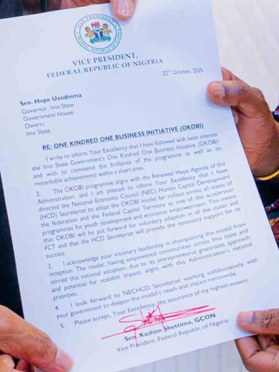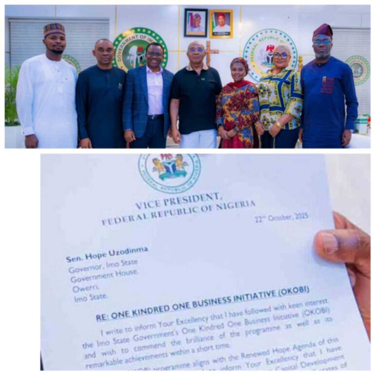 In a formal letter seen by DrumAfricanews, Vice President Senator Kashim Shettima commended Governor Hope Uzodimma’s One Kindred One Business Initiative (OKOBI) and announced its adoption as a blueprint for youth empowerment, human capital development, and grassroots entrepreneurship across Nigeria.